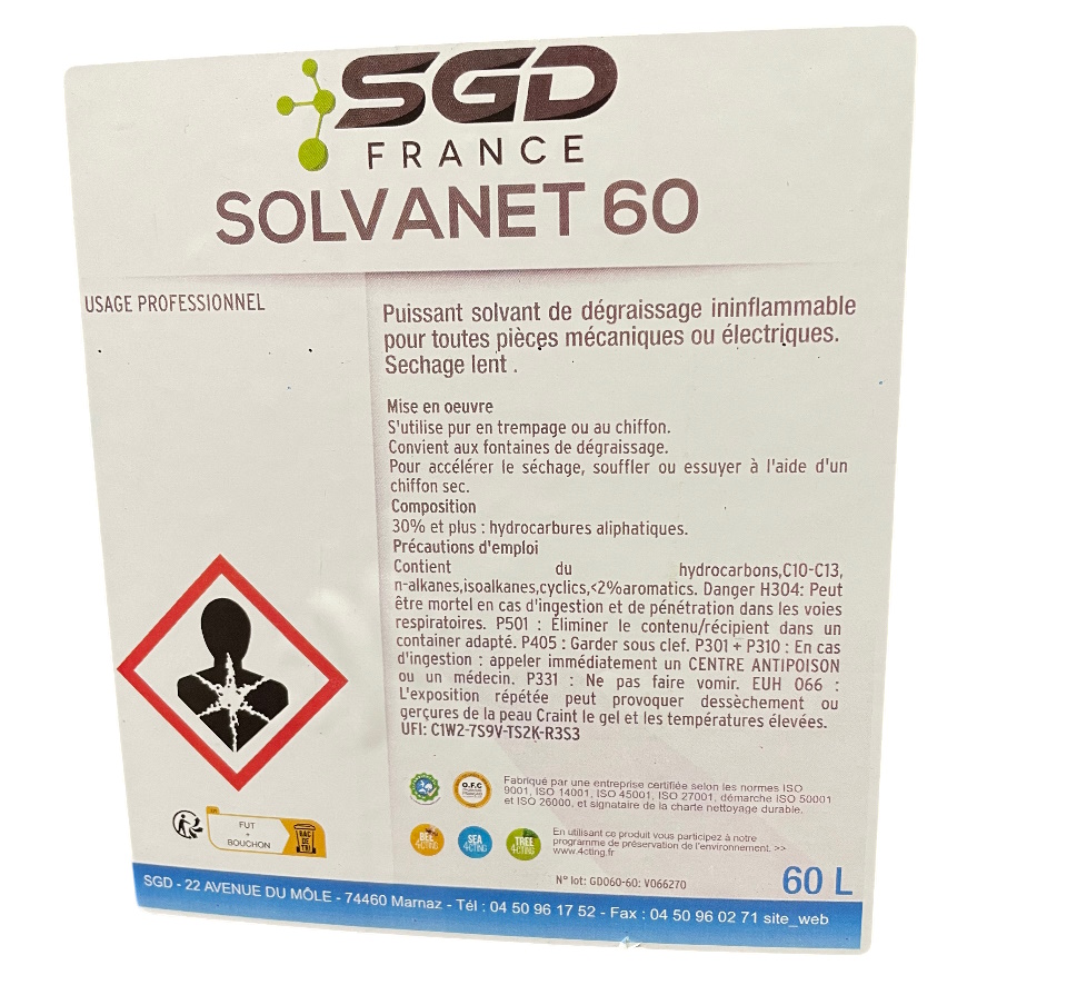 SOLVANET est un solvant de dégraissage de sécurité, hydrocarboné, désaromatisé et sans chlore, avec un point éclair > 60°C.