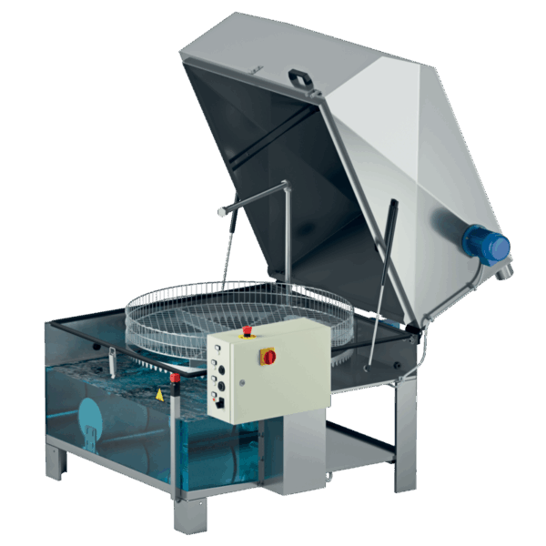 Machine de lavage automatique sur panier rotatif pour pièces mécaniques, avec réglage de la température et durée de cycle, aspiration vapeur.